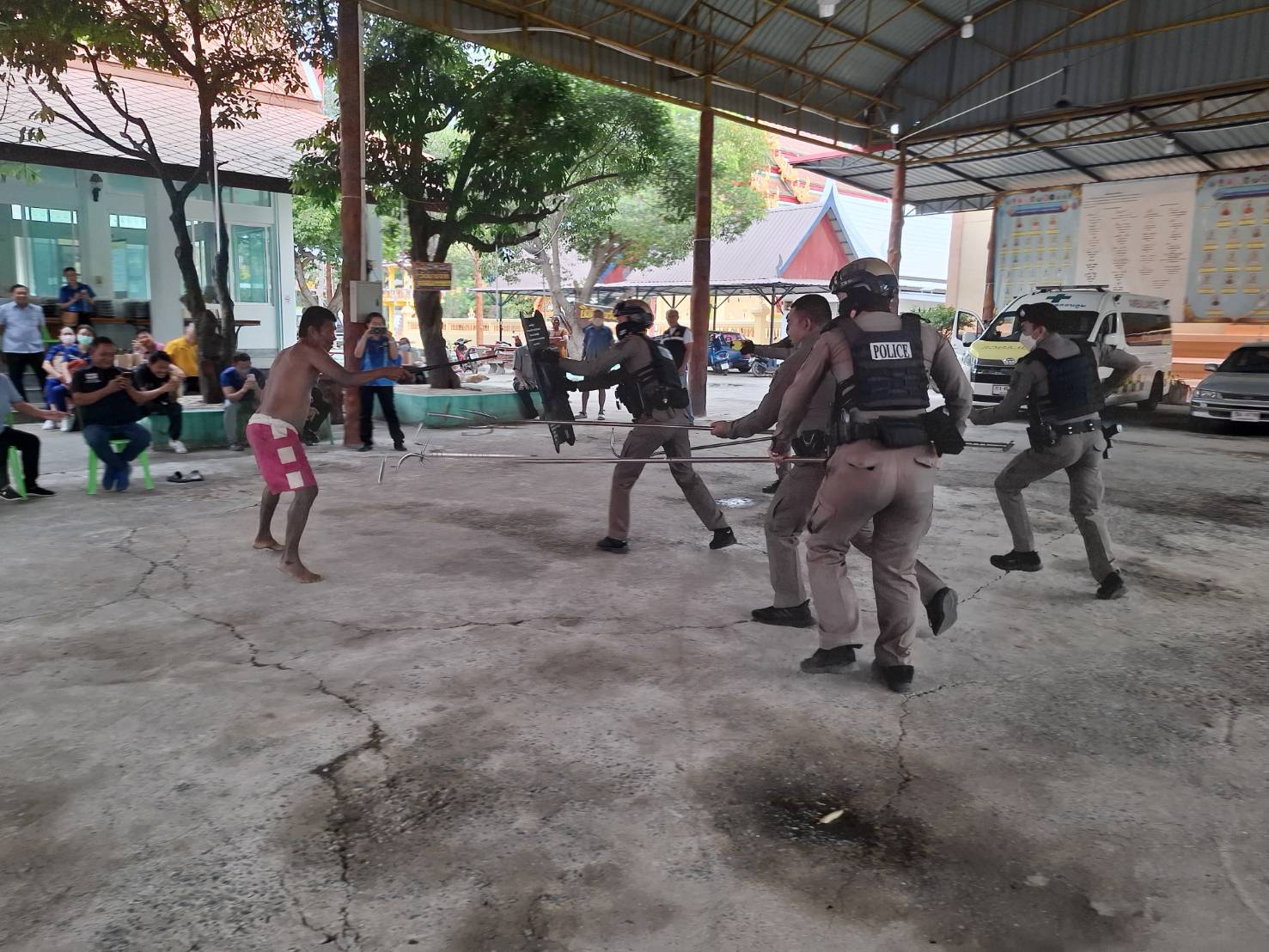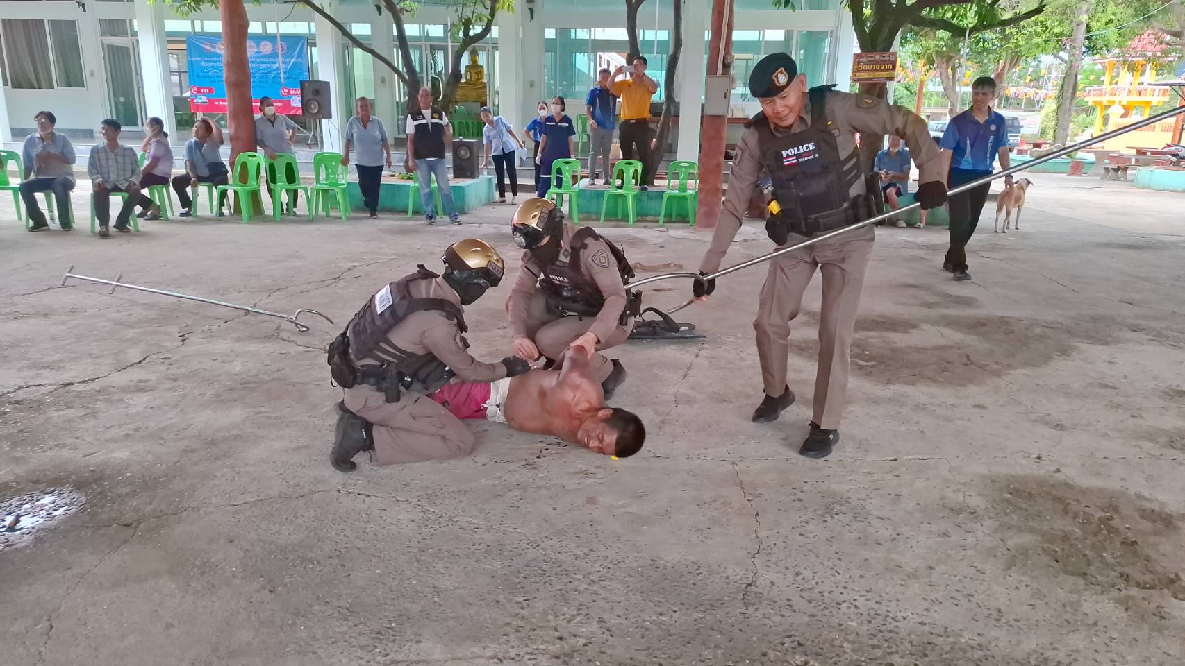 พ.ต.ท.ไชยา ใจหาญ สวป.สภ.ดอนตูม พร้อมด้วยสายตรวจรถยนต์ สายตรวจรถจักรยานยนต์ อบรมเชิงปฏิบัติการซ้อมแผนเผชิญเหตุผู้ป่วยจิตเวชยาเสพติด